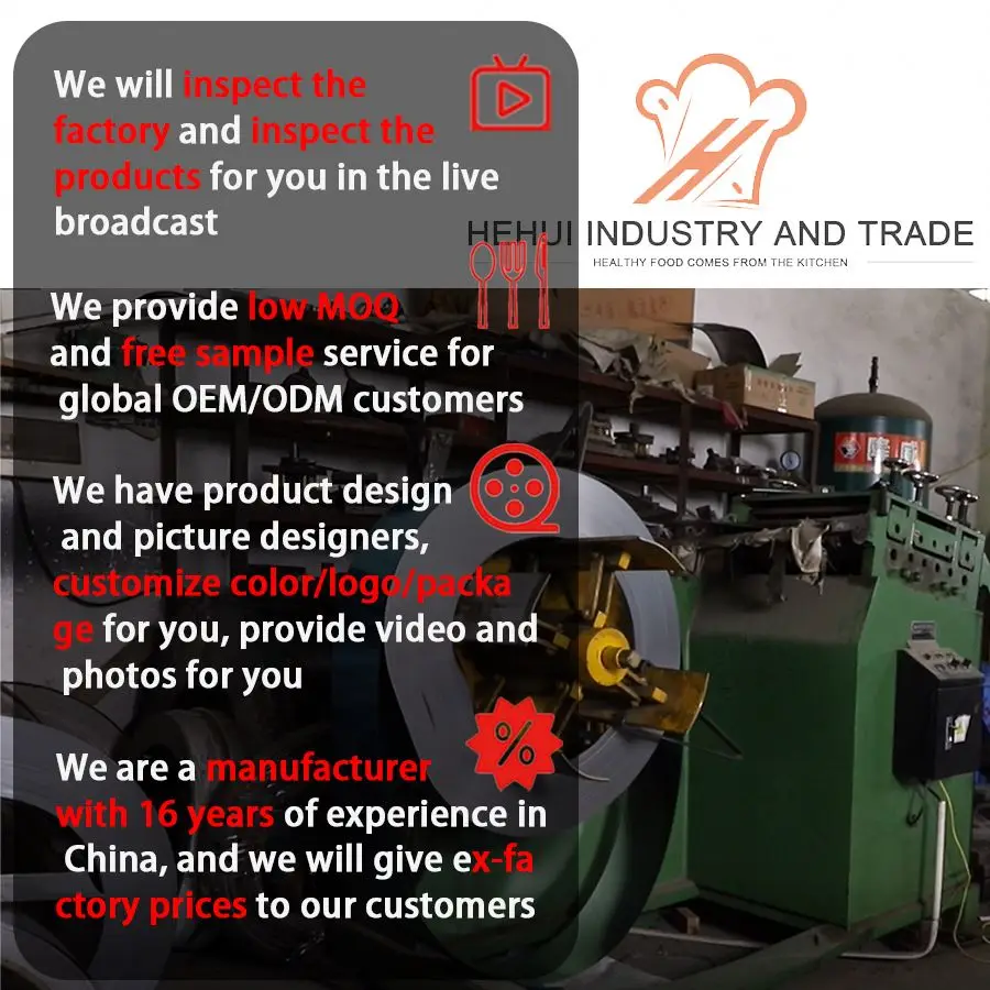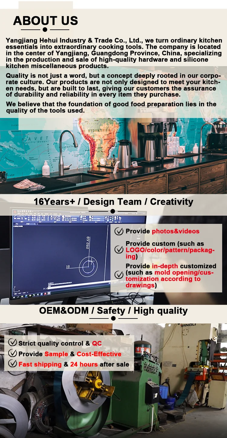 Yangjiang Hehui Industrial and Trading Co. is a company that operates its own factory and maintains a professional business team. Our expertise lies in the research, development, production, sales, and service of kitchenware, kitchen accessories, vegetable cutting tools, and other kitchen-related products. We utilize various materials such as metal, silicone, and wood in our manufacturing processes, which include mold making, injection molding, electroplating, polishing, and electrolysis. In addition to our standard product offerings, we also provide OEM customization, new product development, packaging customization, logo customization, and product color customization services. Our experienced OEM/ODM team and knowledgeable business team are dedicated to providing customized and professional services for cross-border transportation. With 14 years of experience, we have served customers across all seven continents, offering services such as product customization, logo branding, and custom packaging. We are also committed to supporting Amazon sellers with our professional services. Beyond product customization and manufacturing, we have a dedicated team to serve customers and provide cross-border transportation services. Our factory employs over 100 people with a daily production capacity exceeding 50,000 pieces and an inventory of 200,000 pieces. Equipped with professional facilities, our production and manufacturing workshop ensures high-quality products that hold production patents and certifications. We cordially invite you to visit our factory and look forward to the opportunity to collaborate with you!